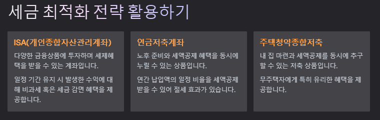 - 비과세 금융상품을 활용해 절세 효과를 극대화합니다.