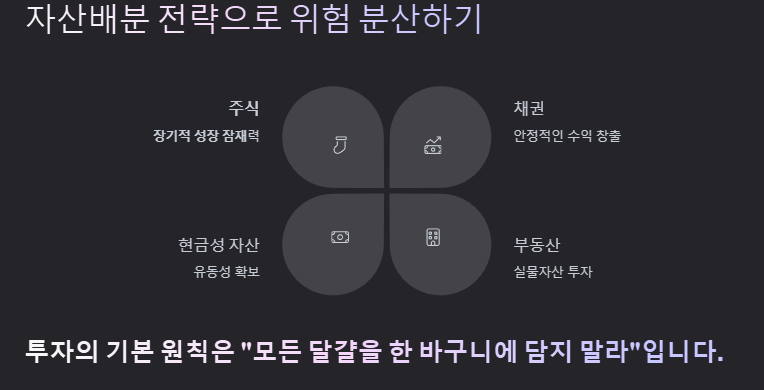 투자의 기본 원칙은 "모든 달걀을 한 바구니에 담지 말라"입니다. 다양한 자산에 분산 투자함으로써 위험을 줄이고 안정적인 수익을 추구할 수 있습니다.