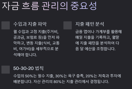 - 50-30-20 법칙 적용: 수입의 50%는 필수 지출, 30%는 욕구 충족, 20%는 저축과 투자에 배분합니다.