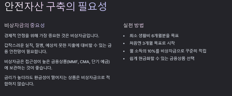 - 비상자금은 접근성이 높은 금융상품(MMF, CMA, 단기 예금)에 보관합니다.